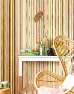 Geradlinigkeit nimmt Streifentapete Zeno nicht so wörtlich. Warum auch – Frei Hand gezeichnete Linien und Streifen in natürlichen Waldfarben wie Beige, Beigerot, Farngrün und Sepiabraun zeigen, dass Bewegung im Spiel ist und sich etwas tut. Dieses offensive Streifenmuster regt die Fantasie an und setzt einen gekonnten Kontrast zu einer zurückhaltenden schnörkellosen Einrichtung. Mit Möbeln aus Naturmaterialien wie Holz, Rattan, Bast verschmilzt die hochwertige Vliestapete zu einer sehr ursprünglichen Einheit – ganz nach dem Motto „Zurück zu den Wurzeln“.