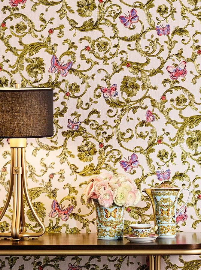 Pompös und plastisch inszeniert wie historische Stuckhandwerkskunst präsentiert sich die Ausführung der Versace Luxustapete Glory. Ein bunt schimmerndes Farbenbouquet aus Blaulila, Erdbeerrot, Olivgelb Schimmer, Grünbeige Schimmer verleiht den floralen Ornamenten, Schmetterlingen und kleinen Käfern eine herausragende Anziehungskraft.