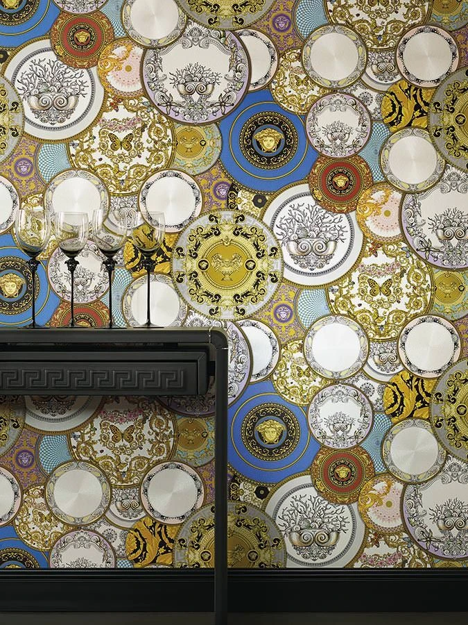 Versace präsentiert: Ein Sonnensystem aus prunkvollen Kreisornamenten, die beim genauen Hinsehen majestätisches Tellerdekor mit fantasievollen Kreationen abbilden. Neobarocke Ornamente, Art Deco-Geometrie, Schmetterlinge, Muscheln, Korallen, die mystische Medusa – Erschließen Sie im Raum die prächtigste aller Galaxien mit dieser extravaganten Luxustapete, die eine strapazierfähige Vinyloberfläche besitzt.