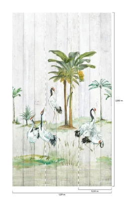 Diese Szene mit Wasservögeln, Schilf und Palmen könnte in der Südsee spielen. Das maritim-tropische Flair des dreiteiligen Wandbildes zieht gute Laune an, entspannt und regt zum Tagträumen an. Die hoch waschbeständige Vinylbeschichtung der Romantik Tapete erlaubt einen sehr flexiblen Einsatz.