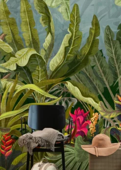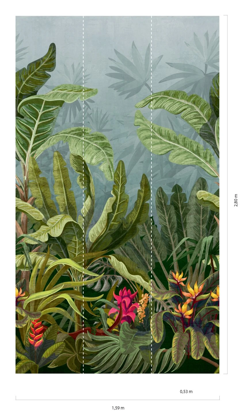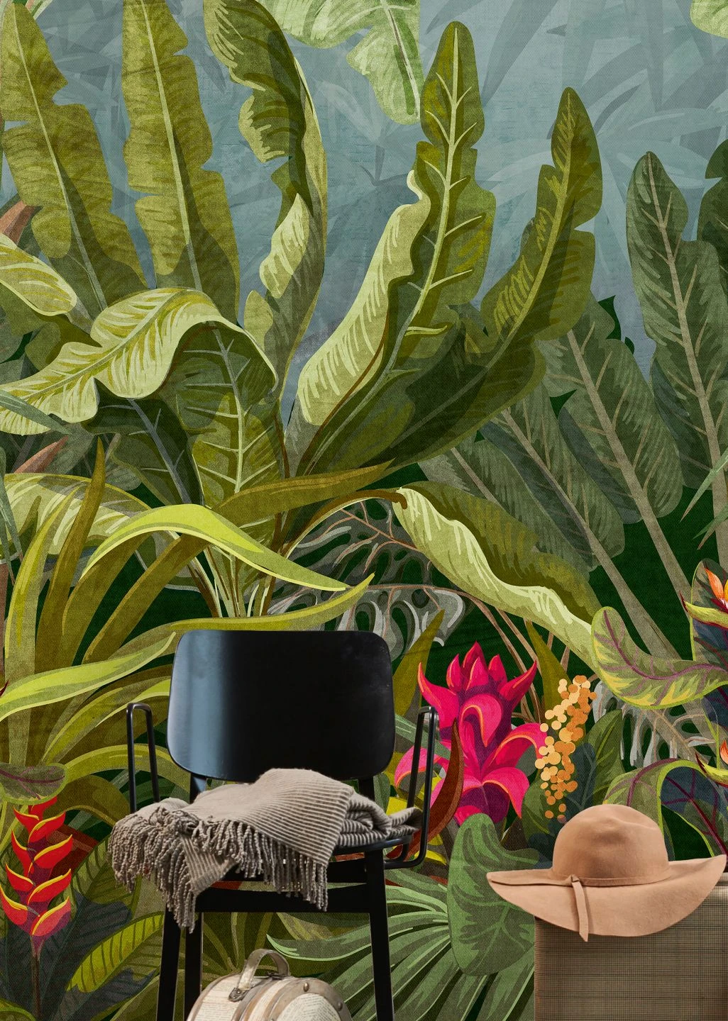 Zwischen üppigen exotischen Pflanzen mit bunt leuchtenden Blüten hindurch fällt der Blick auf nebelverhangene Palmen. Das Wandbild Borneo öffnet Ihren Raum wie eine Glaswand und erlaubt Ihnen den Traum von einem tropischen Paradies voller Abenteuer und Entdeckungen. Grün- und Türkistöne dominieren und schaffen eine lebendige, wunderschöne Kulisse. Mit Blick auf die fantastischen Pflanzen fällt der Alltag von Ihnen ab.