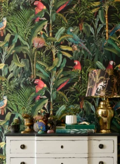 Papageien mit ihrem prächtig bunten Gefieder sorgen für Farbkleckse inmitten der tropischen Blattpflanzen und Palmen auf dem dreiteiligen Wandbild. Auf dem dunklen Grund kommen ihre leuchtenden Farben ebenso wie die unzähligen Grüntöne der Vegetation wunderbar zur Geltung. Ungeheuer lebendig wird Ihr Raum mit dieser tropisch-üppigen Kulisse, die Sie mit Möbeln in einer passenden Farbe gekonnt unterstreichen.